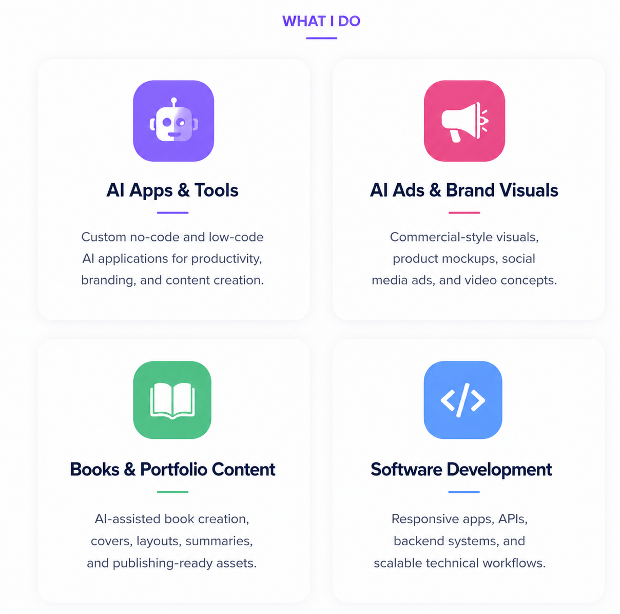 I design and build responsive digital experiences, AI-powered apps, brand visuals, books, ads, and multimedia content using modern software tools and generative AI workflows.